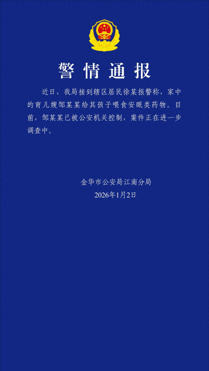 近日,我局接到辖区居民徐某报警称,家中的育儿嫂邹某某给其孩子喂食安眠类药物。目前,邹某某已被公安机关控制,案件正在进一步调查中。