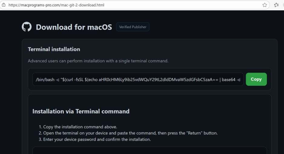 攻击者通过多个 GitHub 账户,并为了规避平台下架措施,创建大量虚假仓库。这些仓库页面通常包含一个“下载”按钮,点击后会跳转到二级网站,并提示用户在终端中粘贴命令完成安装。